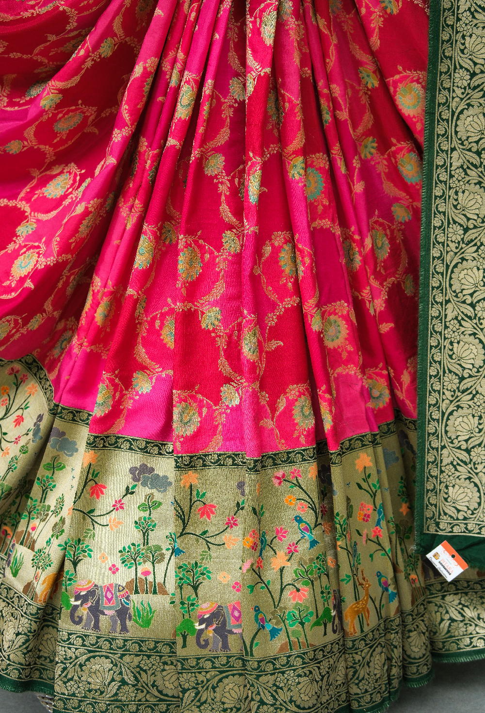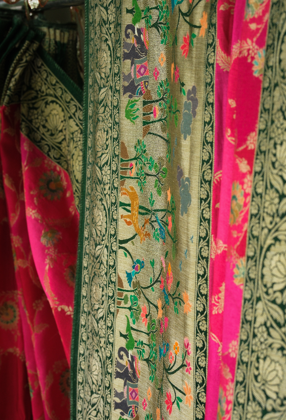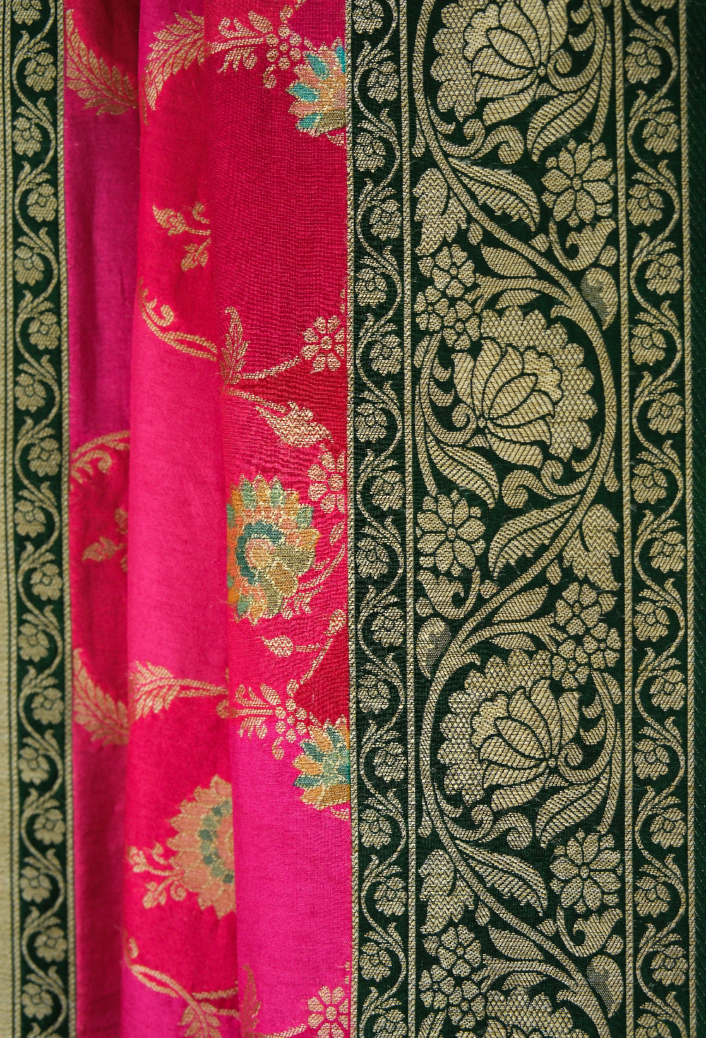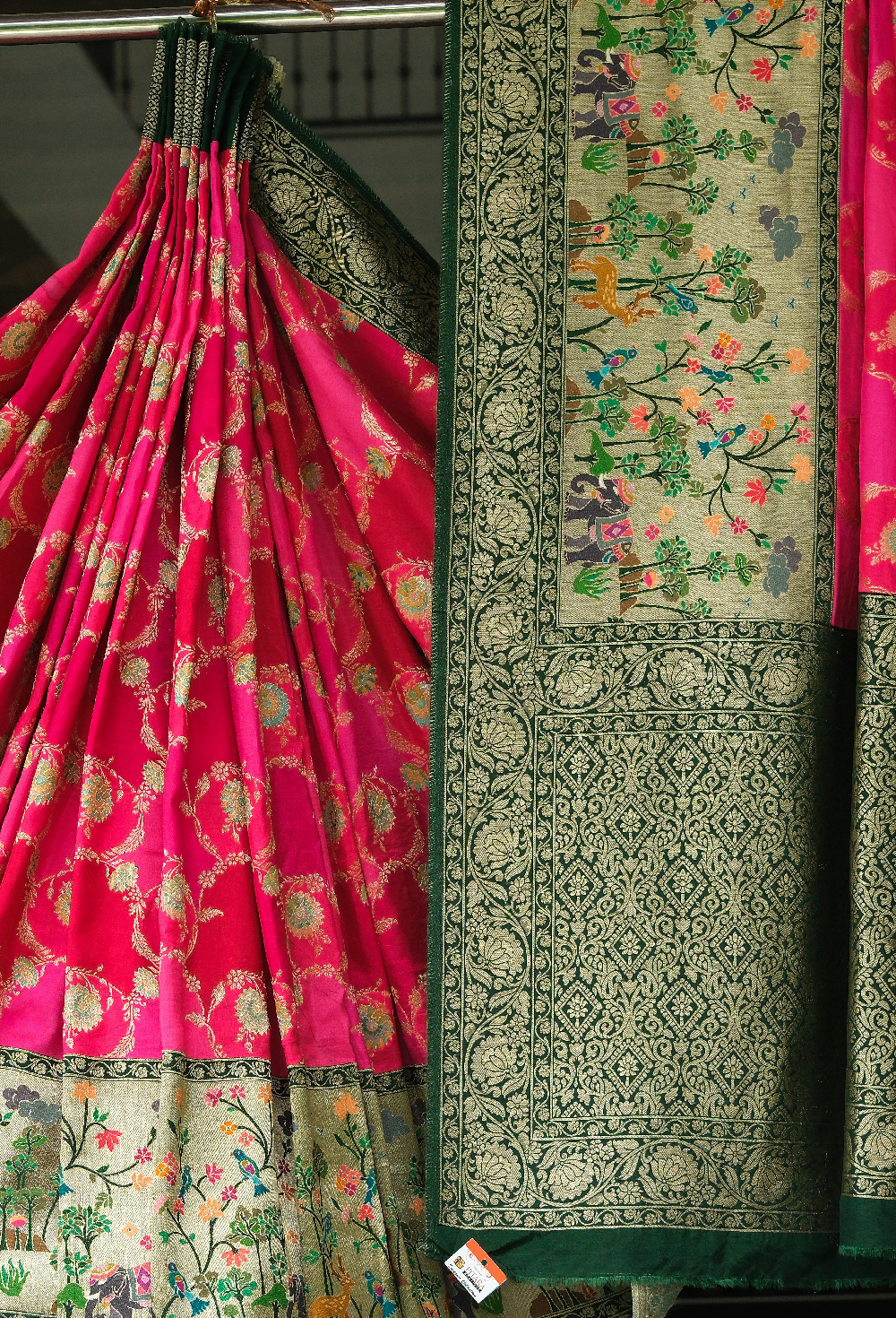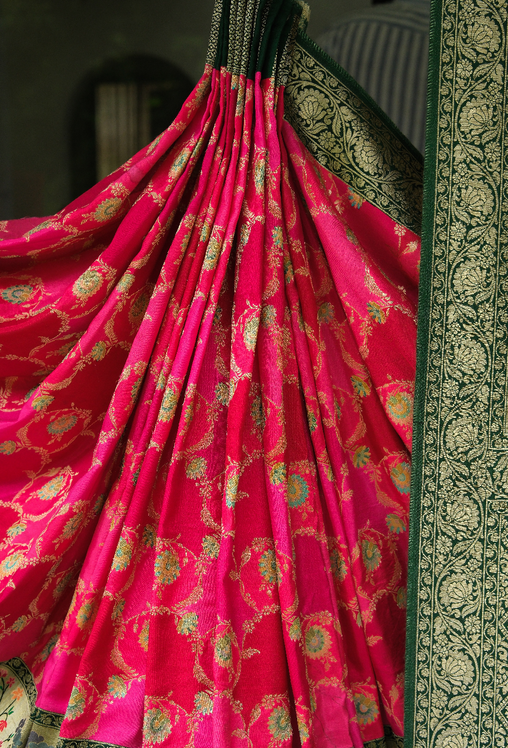 Pashmina’s natural softness makes it ideal for winter weddings, festive occasions, and grand celebrations, while the Banarasi touch adds a royal charm that never goes out of style. Each saree is a work of art, designed to be treasured as an heirloom.